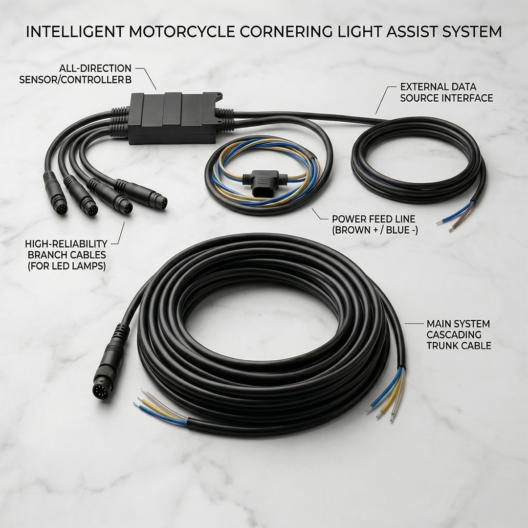 Plug-and-Play System: The intelligent motorcycle cornering light assist system cascading trunk cable makes cascading multiple systems a breeze. Everything is labeled (like the all-direction sensor/controller hub, the power feed line, the branch cables, the external data source interface).